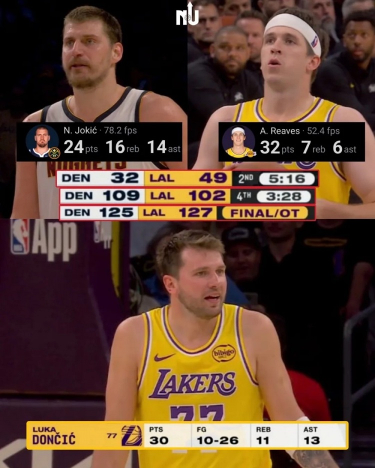 湖人一度领先到17分,但约基奇看破湖人策略,找布鲁斯·布朗,找底角的琼斯,连续追近。湖人则是卢卡与里夫斯轮流找穆雷。